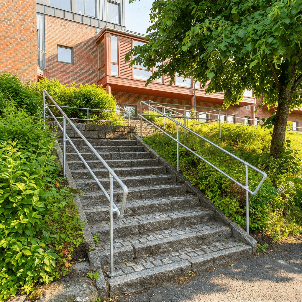 Sikre hjemmet eller næringsområdet ditt med et holdbart rekkverk i galvanisert stål. Perfekt for trapper, skråninger, ramper og andre områder hvor du trenger ekstra støtte og trygghet – spesielt nyttig på glatte vinterdager.